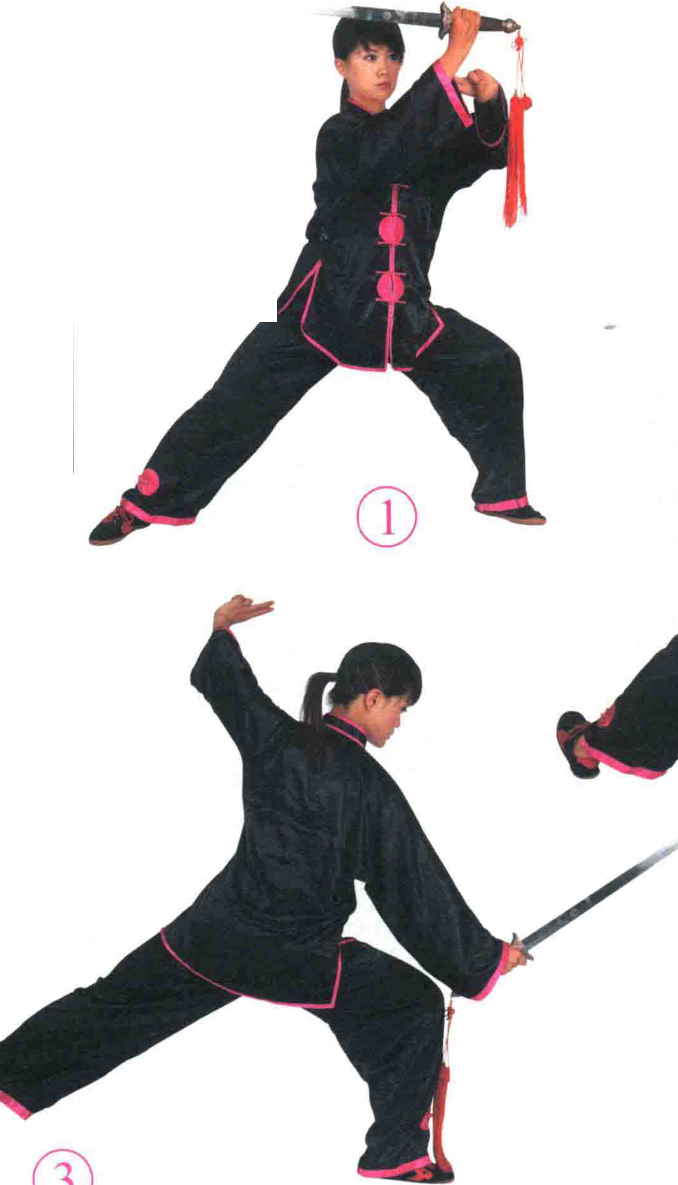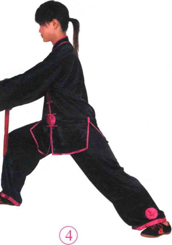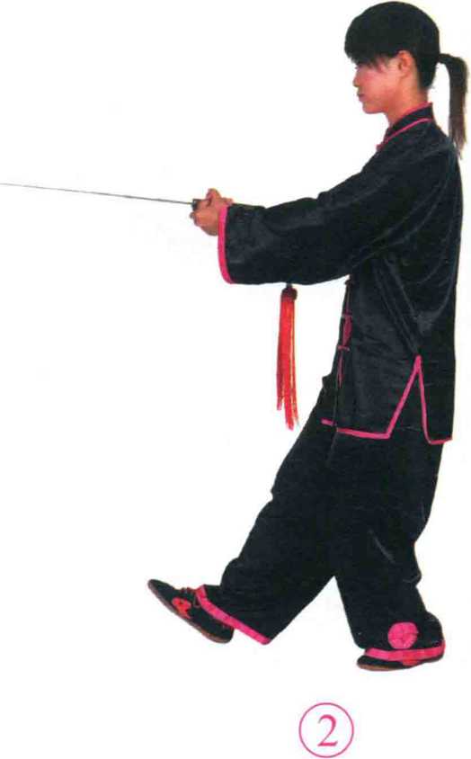 ?右脚向前跨步落地,重心移至右腿成弓步。 同时两手持剑向前下方刺出,剑尖朝前下方。目 视剑尖。