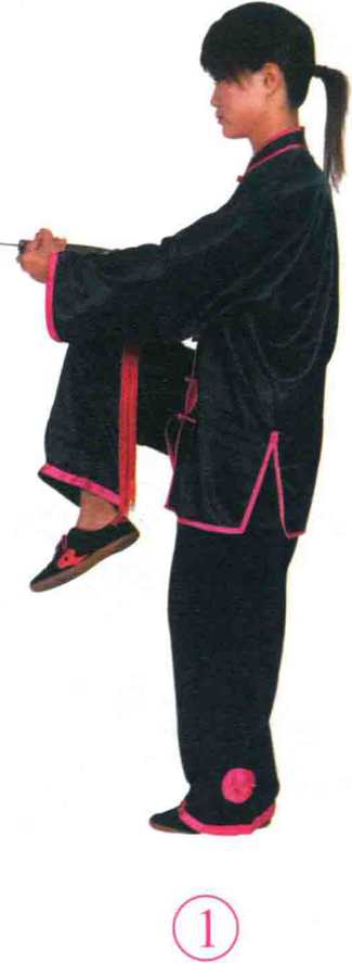 ?身体微右转,重心移至左腿,右腿屈 膝提起,右脚自然下垂。同时右手持剑 与左手相合于腹前握剑把,剑尖朝前与 腰平,目视右前方。