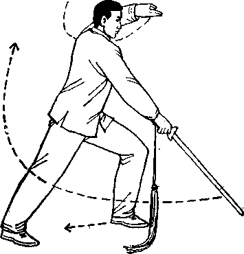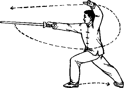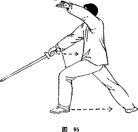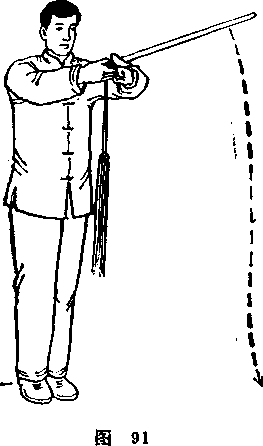 右脚踏实后身体立起,左脚向前上一步,右脚随即向前 并步(脚掌踏地)I右手持剑从左向后经头部环绕到体前 (剑尖向前),左手剑指变掌,在体左侧划弧后与右手合棒 剑(在右脚并步时),向前平刺;眼视剑尖.(图91)