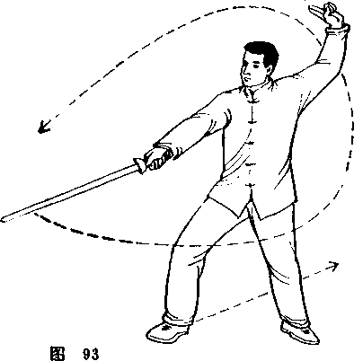 接上动,上体稍向右转,撤右腿,脚踏实,身体重心移 过;上体稍向左转,撤左腿;右手持剑从前向后向上向前划 立圆劈,左手剑指附于左额旁(在劈剑时),眼随剑走(图 92、图93、图94、图95).以上动作重复做两次.