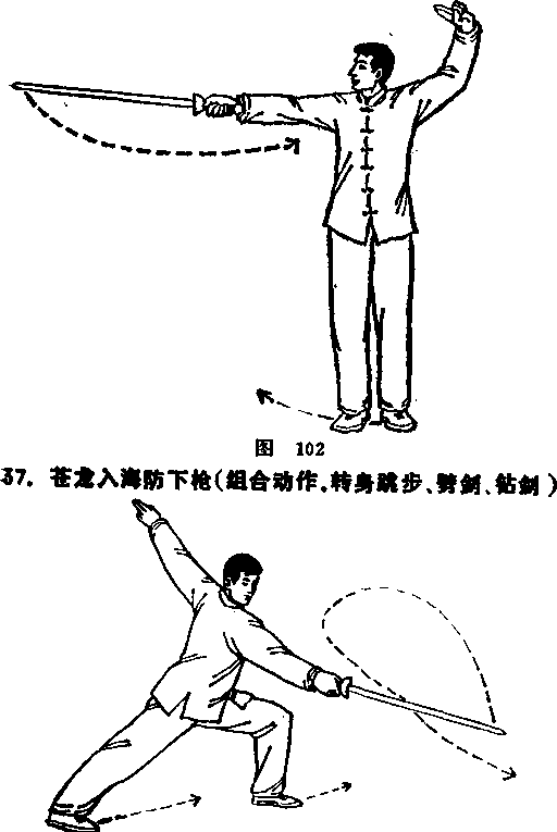双腿微屈站立,上体正直;右手持剑从下向左向上向右 劈;左手剑指从下向上附于头部,左侧向劈剑方向指出; 双脚并步站立,眼看劈剑方向。(图项1、图102).