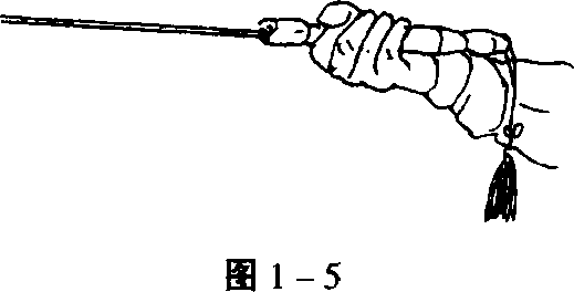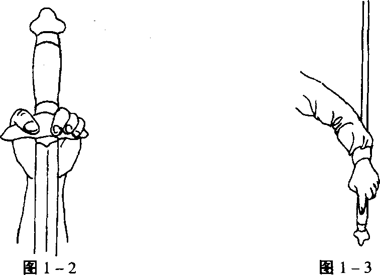 平剑(刃朝左右),拇指和食指贴靠护手,其余 两指并拢握紧剑柄,多用于刺剑等。(图1-5)