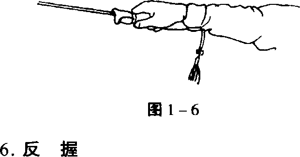 平剑(刃朝左右),手心向下,拇指、食指和虎 口钳夹,其余三指松握剑柄,多用于抹剑、撩剑。 (图 1-6)