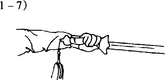手心向前贴紧护手,食指附于剑柄后,拇指和 其余三指扣紧护手,剑后刃平面轻贴前臂,称为阳 手,用于起势。(图1 -2)