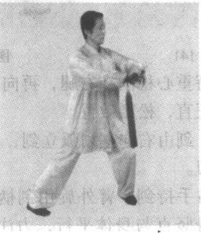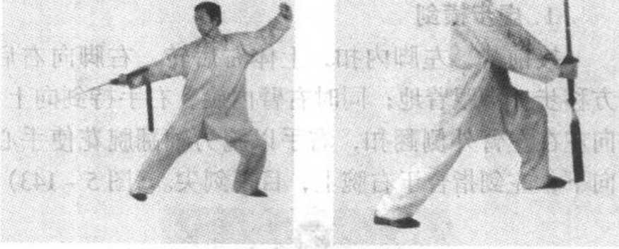② 右手持剑从右向左,臂外旋要立刃抽带,用 剑柄向前戳,沉腕立剑;腕部松活,用拇指、食指 握紧剑柄,其余二指松握,力才能贯注剑前端。