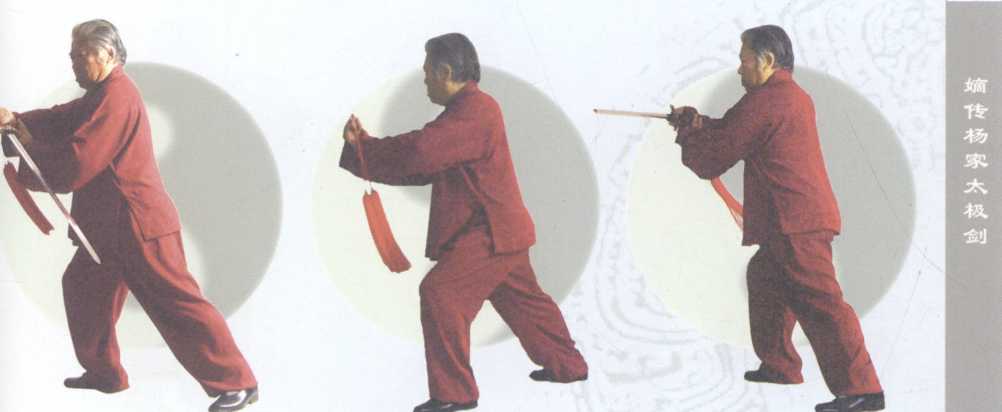 Pivoting on your left heel, raise your right leg and step to the northwest in a bow stance. Using a wrist action, circle the sword back andorward to point diagonally up towards the northwest. Left hand (two fingers) moves in the opposite direction to the right hand (Figures 90 一 91)?