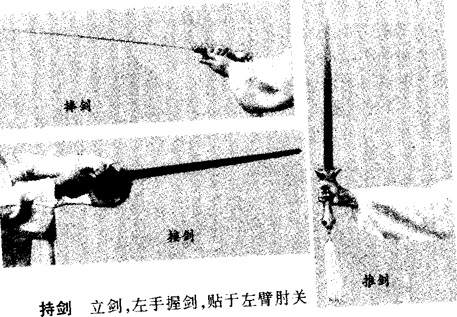 接剑 立剑,回抽时左掌接握剑柄,为接剑法。
