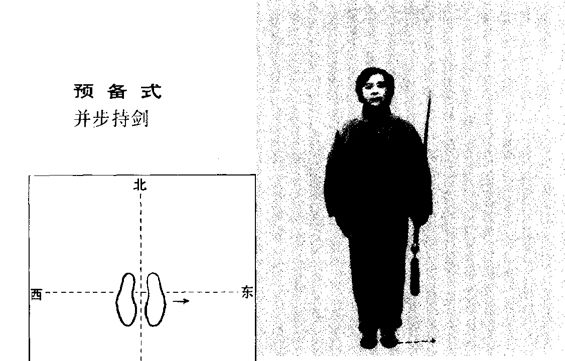 面向正南(假设),两脚靠拢并立,身体正直。两臂自然垂于 身体两侧,左手持剑,剑尖向上;右手握成剑指,手心向内O眼睛 平视前方。