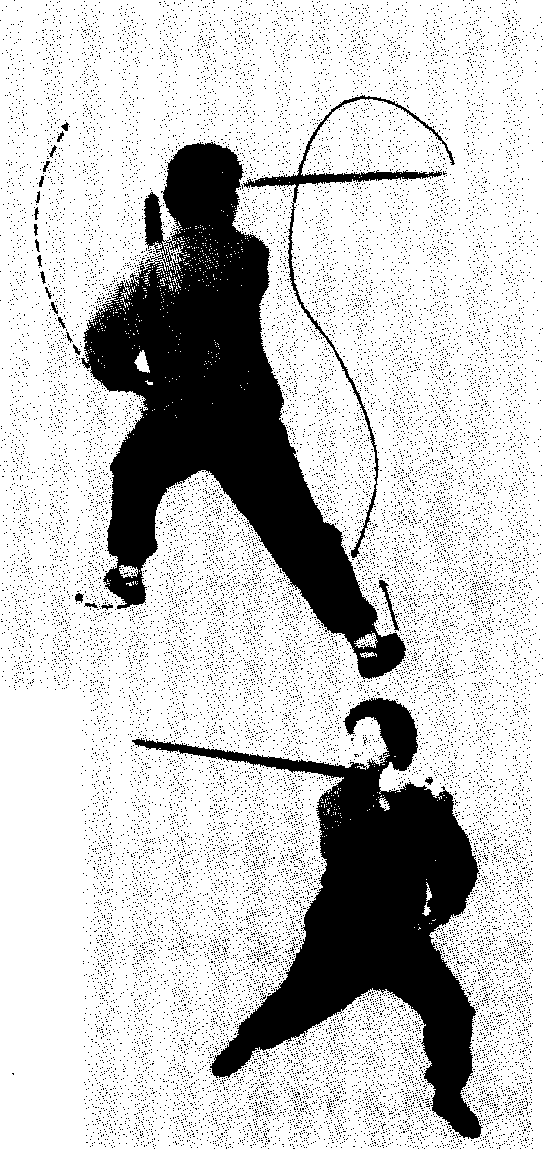 (乌龙摆尾)(二)转体摆剑重心左移,身体左转。同 时右手持剑随转体左平摆于 体前,与头同高,手心向上;剑 指翻转于左腰间,手心向上。 眼看剑尖。左转体时,左腿屈弓,右 脚跟外展,右腿自然蹬直成左侧弓步c右手持剑左摆时,剑柄领先,摆到位时剑尖向右(向 东)。右胯放松,重心在左腿,保持身体中正。继续吸气,剑摆到位时,吸气止。设对方剑向我头部刺来,我用剑紧贴对方剑身向左后方引 化。