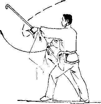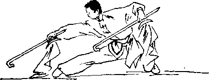 (1)身体重心前上移,左脚向前上一步,同时,两手螺 把握钩由下向左侧上挑起。(正西)力达钩前端,目视左钩. (图36)