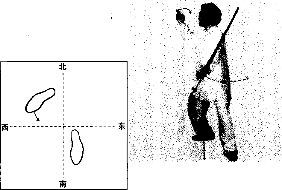 设对方向我膝部刺来一剑,我即摆剑用剑柄格开来剑,准 备用剑指攻击对方。