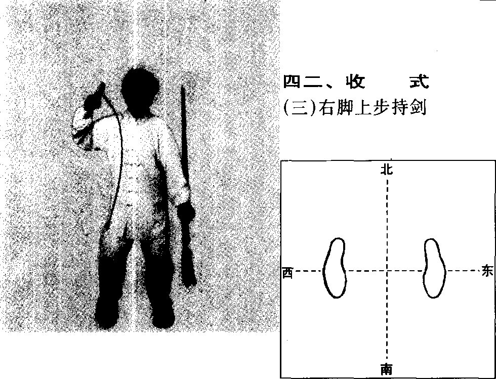 上体左转,重心前移,右脚上步成平行步。同时右手剑指屈 肘下按于胯旁,左手握剑至左侧胯旁,剑身竖直贴于左肘,剑尖 朝上。目视前方。