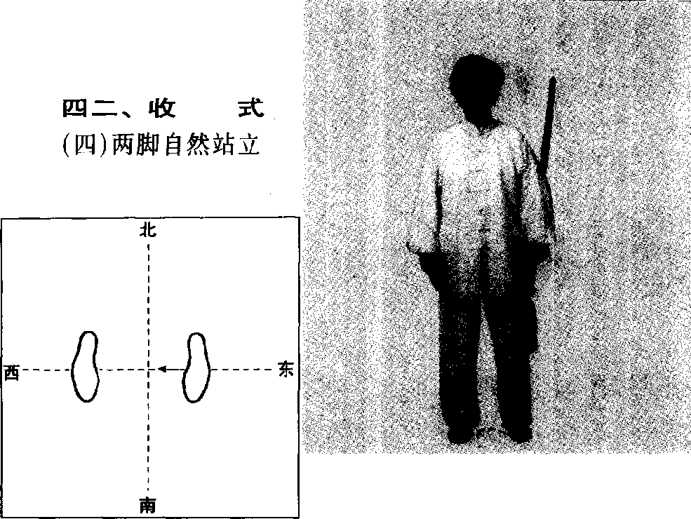 两腿自然伸直。同肘右剑指经胸前向下落于身体右侧胯 旁。目视前方。