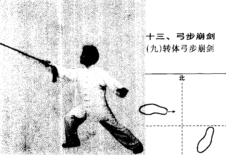 重心前移,右腿屈膝;左腿自然蹬直,成右弓步。上体继续右 转,同时右手握剑向右摆崩剑,劲贯剑身前上端,腕同肩高,剑尖 高于腕,低于头,手心朝上;剑指向左分展,停于胯旁,手心朝下, 剑指朝前。目视剑尖。
