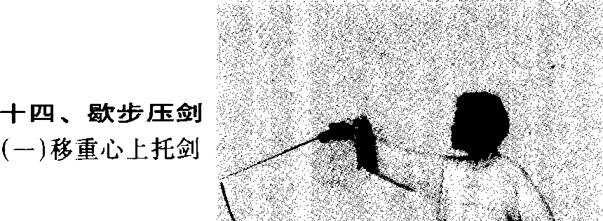 上体微左转,重心后移至左脚,左腿自然弯曲;右腿自然伸 直,成右虚步。同时右手握剑向上托起,剑指自然摆起。目视剑 尖。