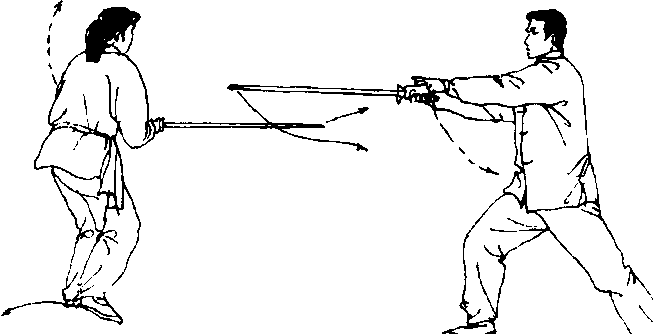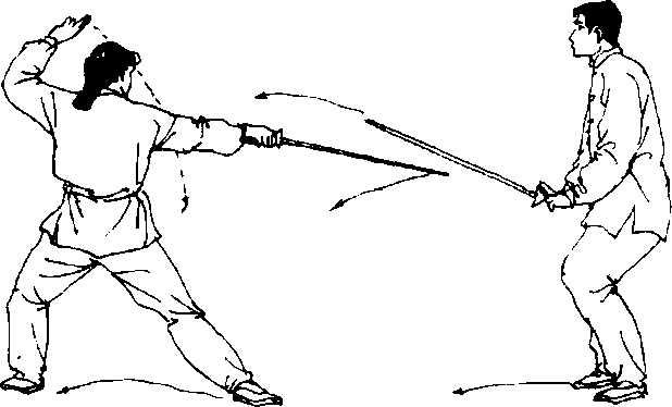 乙右手剑向里裹成老阳(手心向上),将剑带回, 左手手掌立起,手心抵住剑把,右脚同时撤到左脚旁, 脚尖着地,两腿微屈,眼看对方,躲过甲刺来之剑。 (图 101J02)