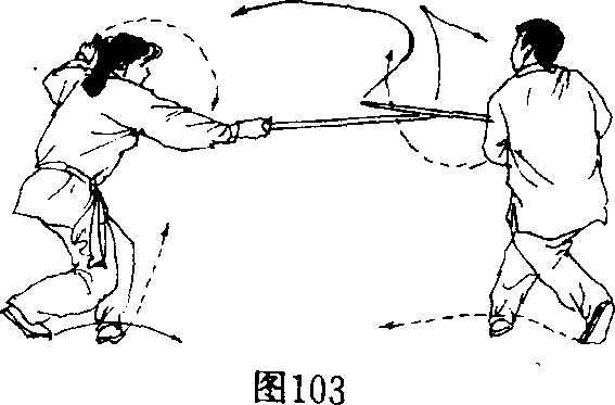 甲右脚稍后撤,脚尖外摆,以左脚尖为轴,身体右 转,并向下蹲,左膝抵住右胭窝处(歇步),右手剑扭成 太阴(手心朝下),随身体右转时,将剑抽回到身前,躲 过乙刺来之剑。(图103)