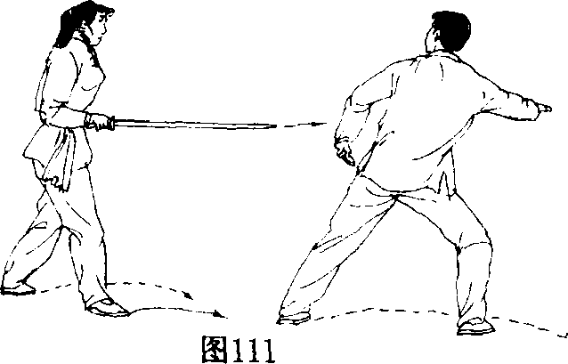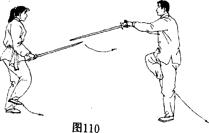 乙见甲剑点来,速将剑抽回,避过甲剑,剑把靠于 小腹部,剑往回抽时,右脚抬起靠于左脚内侧,左腿微 曲。(图110)