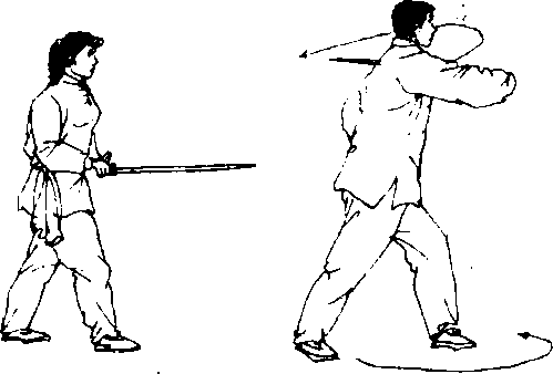 甲右手剑顺乙搅剑之势向身后翻转一圈,剑由里 裹成手心朝上再翻成中阴中阳(立剑),用腕力使剑尖 点刺乙之右腕,在剑动时,右脚向外斜垫一小步,左脚 随即迈出,脚尖稍扣,当剑点刺时,右脚提起,脚心扣 在左膝上内侧,左手扶于右腕上,眼看剑尖。