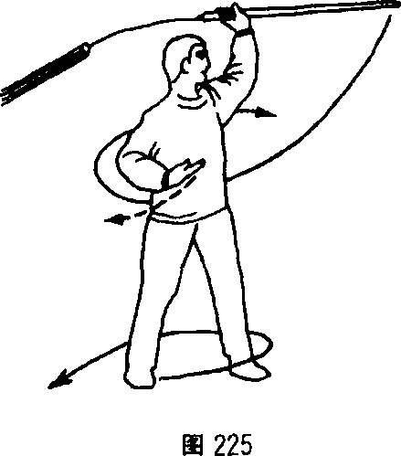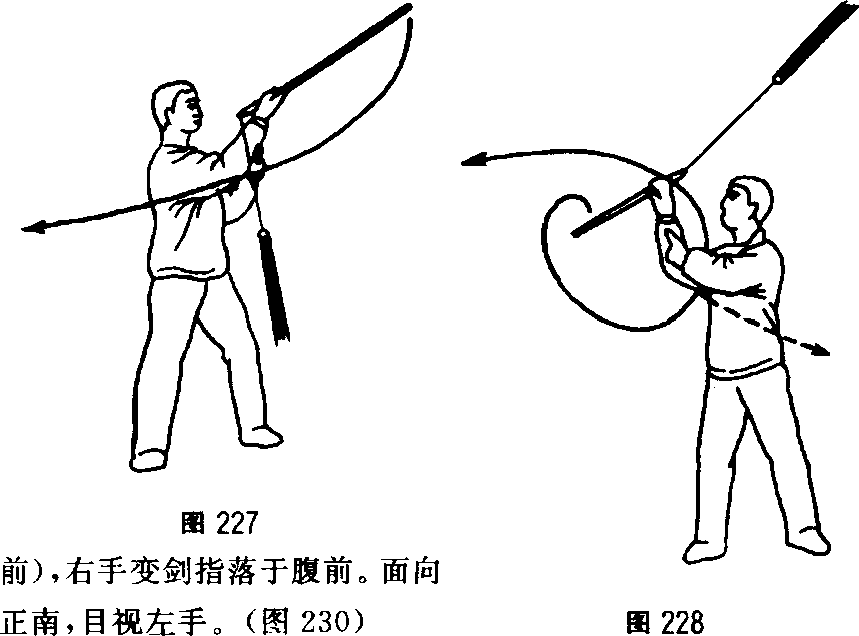 经身后向右侧甩剑柄,同时 右手从身后接握剑柄,随腰 略左转使剑柄贴右胯向东 南方向,右手心向外。(图 226)