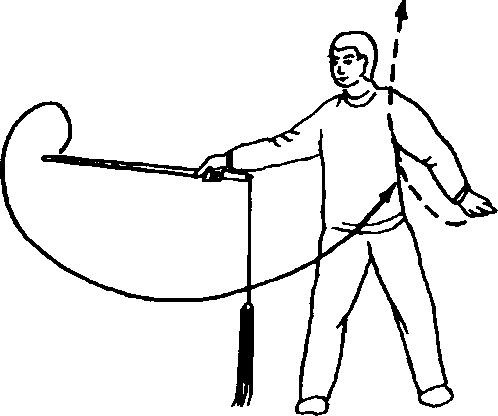 2. 以剑柄带穗绕立圆 (顺时针),就势向上方撩 剑,与头同高。左剑指附于 右腕,穗搭在右腕外侧,胸 向东南。接着向右转,右手 持剑弧形向右上摆,内旋向