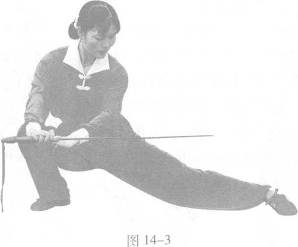 右脚落步(7位),左 脚起跳呈右弓步,两手捧 剑前平刺(7位),与肩高, 目视前方(7位)(图 14-1、图14-2);重心下压 转右仆步,两手由腰带动 逆时针划弧向右回带,右 手同时翻腕下压剑,两手 掌心相对,目视剑身(图 14-3);起身,重心左移, 身体左转(3位),两手捧