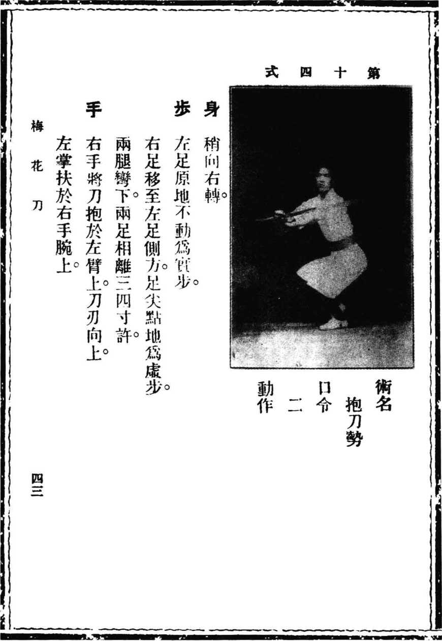身:稍向右转。步:左足原地不动,为实步。右足移至左足侧方,足尖点地,为虚步 两腿弯下,两足相离三四寸许。手:右手将刀抱于左臂上,刀刃向上。 左掌扶于右手腕上。 (第十四式)两手怀抱成圆形。眼:向左视。用法预备进攻,陈而未发之势。 术名抹刀势 n令三身:向右转。步:右足先往右迈半步。 (第十五式)用法梅花刀兩手懷抱成圆职 眼向左亂W備進斯陳而未發之%身向右轉歩右足先W右邁卞4.四四用法梅花刀兩手懷抱成圆职 眼向左亂W備進斯陳而未發之%身向右轉歩右足先W右邁卞4.四四