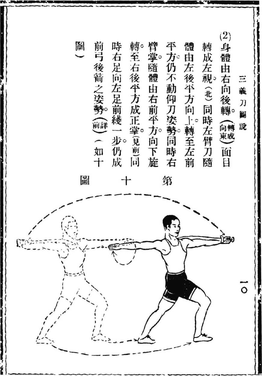 2. 身体由右向后转(转成向东),面目转成左视 (北)。同时,左臂刀随体,由左后平方向上,转至左前 平方,仍不动仰刀姿势;同时,右臂掌,随体由右前平 方,向下旋转,至右后平方成正掌(见前)。同时,右足 向左足前线一步,仍成前弓后箭之姿势(详前)(如十 图)。