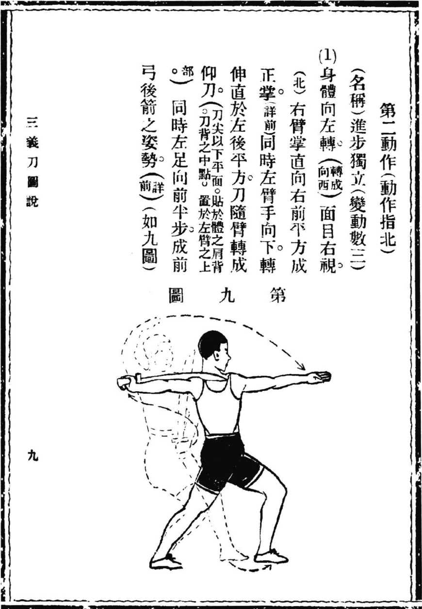 1. 身体向左转(转成向西),面目右视(北)。右臂 掌直向右前平方成正掌(详前);同时,左臂手向下,转 伸直于左后平方,刀随臂转成仰刀(刀尖以下平面,贴 于体之肩背。刀背之中点,置于左臂之上部)。同时,左 足向前半步,成前弓后箭之姿势(详前)(如九图)。