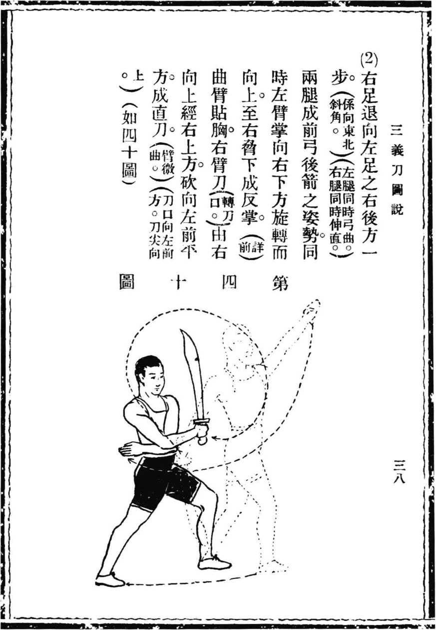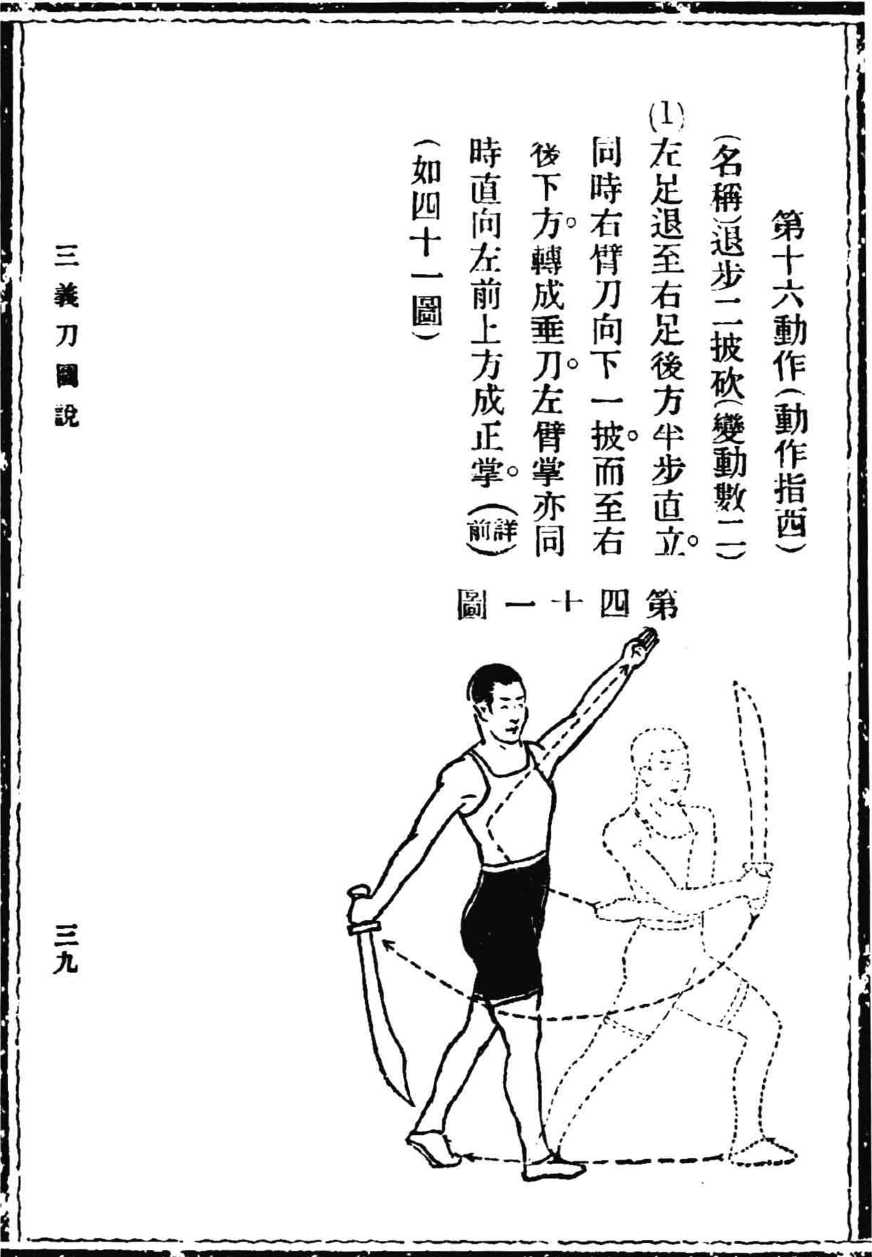 (第四十图)第十六动作(动作指西)名秫退步二披砍(变动数二)1.左足退至右足后方半步直立。同时,右臂刀向下 一披,而至右后下方,转成垂刀,左臂掌亦同时直向左 前上方成正掌(详前)(如四十一图)。(第四十一图)