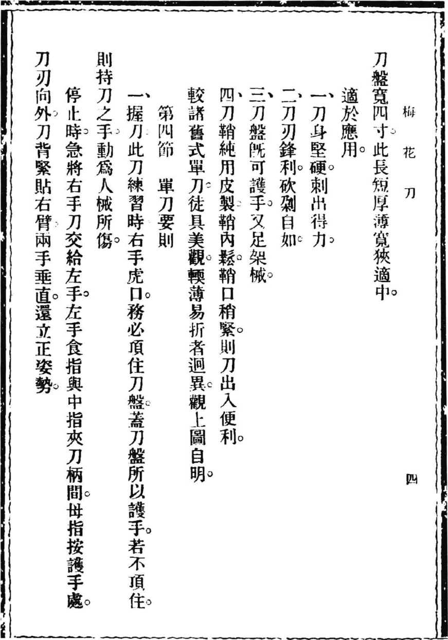 此刀练习时,右手虎口,务必顶住刀盘;盖刀盘所以 护手,若不顶住,则持刀之手,动为人械所伤。停止时,急将右手刀交给左手,左手食指与中指夹 刀柄间,拇指按护手处,刀刃向外,刀背紧贴右臂,两 手垂直,还立正姿势。休息时,不可随意将刀尖插地。