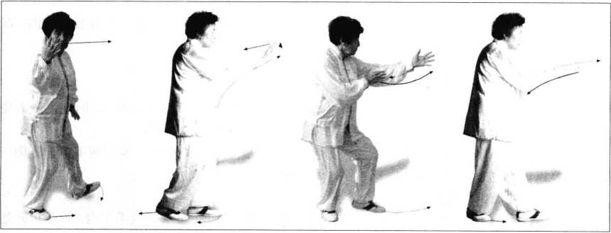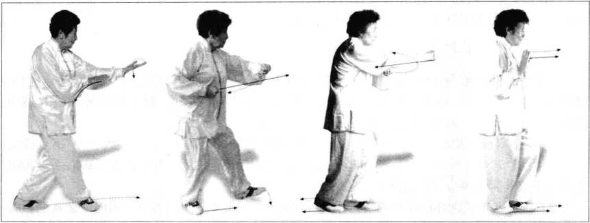 【简注】此式之关键不在两手扑出,而在如何合理运用搠、裹劲,不论向前还是向后,两 手的弧形运动要得机得势,不可拘泥,总要不丢不顶,控制对方为要。
