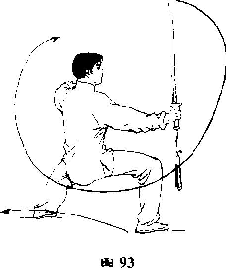 1. 左脚向左后方撤步,左腿屈 膝,随身体重心后移,右脚以脚掌擦 地撤半步,脚跟提起,腿微屈,上体 向右拧转;同时右手握剑,屈肘收至 右肋下,剑身竖直,左手剑指附于右 手心朝下;目视右侧。(图92)