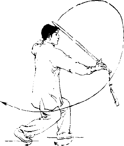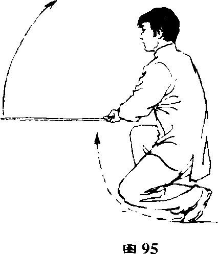 尖朝右上方,虎口仍朝上,腕同胸 高;左手剑指略向前摆举;目视右 前方。(图94)