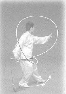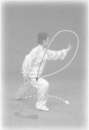 向右转体,左脚向右侧上 步,脚尖内扣。以左脚前掌为轴 拧动,右脚提起向右前方落步前 弓。右手持剑随拧转继续右转, 在额前云剑下落背于身后,左剑 指收至右胸前再指向左前方。目 视左手。