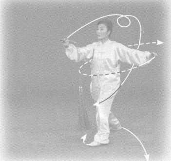 O云剑时上体稍有后仰,手 腕不要从头顶经过,剑穗随剑柄 甩起。