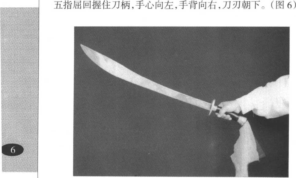 右手握刀,虎口朝上,拇指在左,食指、中指、无名指在右,