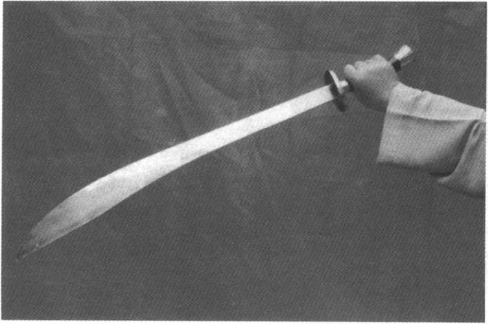 (3)俯手持刀右手握刀,手腕与小臂外旋至刀刃朝右上方,拇指在左下 方,食指、中指、无名指、小指在右上方,手指向上,手心朝下。 (图8)右手握刀,手腕与小臂内旋至刀刃朝上,栂指在右,食指、 中指、无名指、小指在左,五指屈回握住刀柄。(图7)