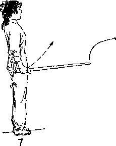 1. 两脚开步站立;右手握剑提于右腿外侧,剑身横平, 左剑指按于左腿外侧》目视前方(图7)。