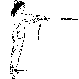 两脚并步站立;左臂内旋成手心向后握住剑柄,拇指扣 住内侧剑格,中指、无名指和小指扣住外侧剑格,食指伸直 压住釗柄.使剑身贴靠小臂垂立于左臂后,右臂伸直贴靠右 腿外侧(图〇。