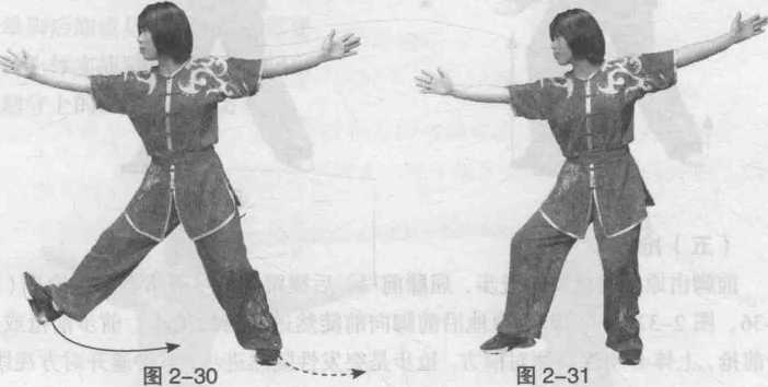重心置于中间,上体保持侧身不变,两眼正视前方(图2-30、图2-31)。后 脚后退时,前脚蹬地,推动后脚移动,随即跟退;前脚后退与后脚后退的步幅,