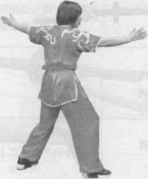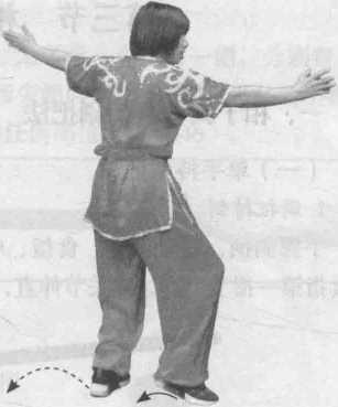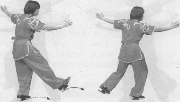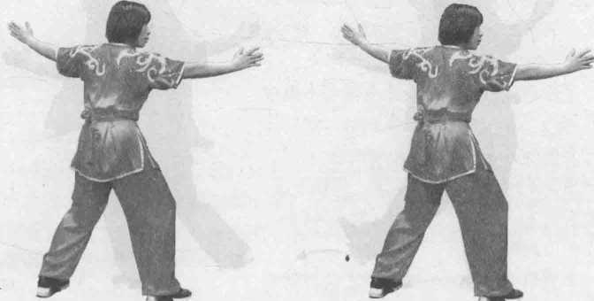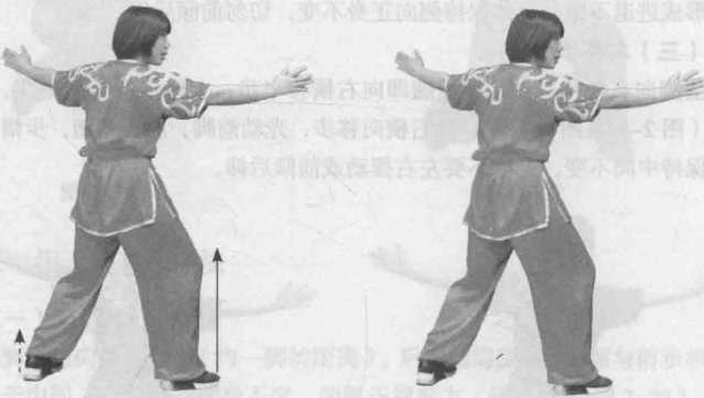 前脚向右横移半步,后腿随即向右横移半步;上体保持侧身不变,眼视 前方(图2-32、图2-33)。向右横向移步,光动前脚,后脚相随,步幅相同,