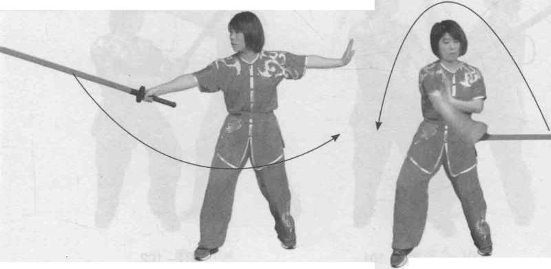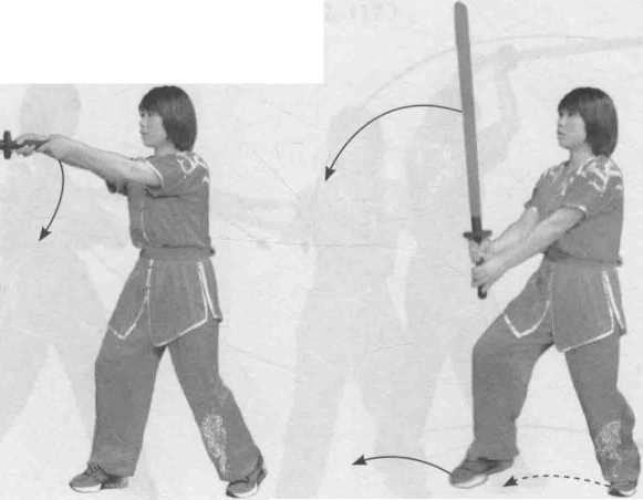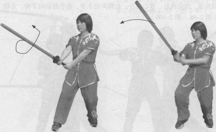 右脚在前,向右前上步,同时右手持剑由上向前绕挂,并顺势翻转手腕 举剑到头顶,剑尖向后,掌心向外;右脚向前上步,右手持剑向下劈,力达 剑身(图 2-98 ~ 图 2-100 )。