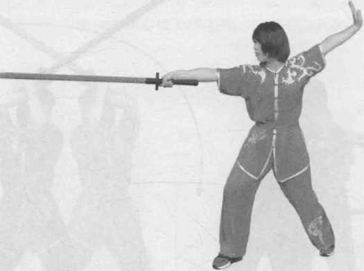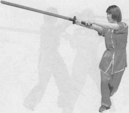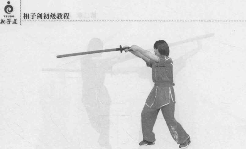 双手握剑柄,手臂外旋拦剑,力达剑身前部7迅即右脚上前一步, 左脚跟步呈倒插步,两手持剑随上步之势向前扎出,剑同肩高,目视前 方(图 2-101 ~ 图 2-103 )。