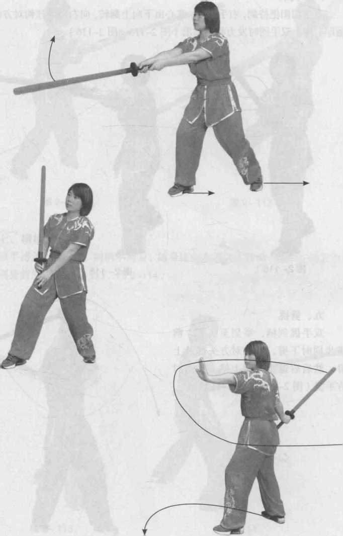 双手握剑柄,举剑至头顶,前 进步同时下劈,进攻对方头部及上 身,然后后退步同时上挑,攻击对 方手腕(图2-117 ~图2-1丨9)。參〇T^。。i相子剑初级教程 相孑道 图 2- 118十、左右扫剑左脚在前,右手持剑举止头 顶,上右脚同时将剑向前横扫,左 脚倒插步时顺势向前下方横扫(图 2-120 ~ 图 2-122)。图 2-119參〇T^。。i相子剑初级教程 相孑道 图 2- 118