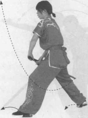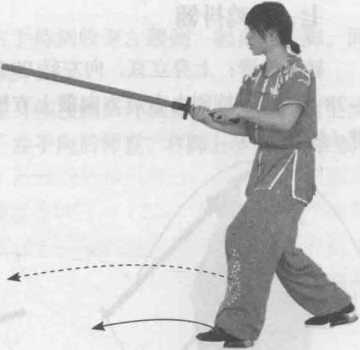 图 3-31相子剑初级教程1左右撩劈□is 解1一上步钩剑:左腿向前跨步落地, 右脚上步脚尖虚点,双手持剑向前 上方钩剑,置于身前(图3-31 )。