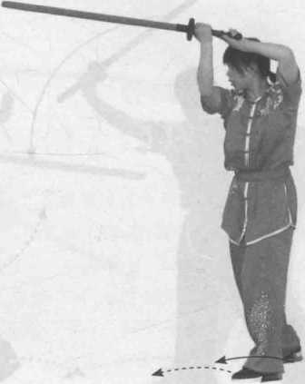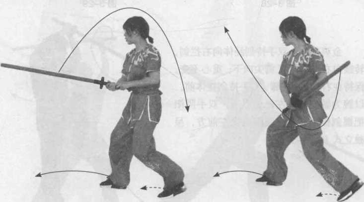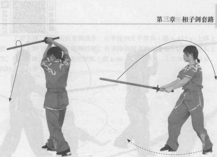 图 3-34 图 3-35〇TXUOO粕孑道右撩劈剑:上动不停,左脚向前上杂成前进步,右脚跟步,同时双手持 剑向上、向后、经体侧顺势向前上方撩出(图3-36、图3-37);左脚向前垫 一步,右脚向前跨步,P时双手持剑向上举,左脚跟步,双手持剑向前下方 劈剑(图3-38、图3-39)。