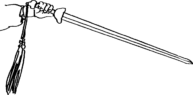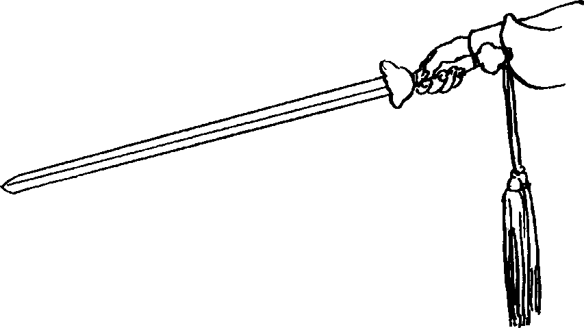 右手持剑,正手,五指握剑,竖剑;拇指向下压剑柄, 无名指和小指上抬剑柄,使剑锋向下点;手腕下弯,以助 点势。(图三11)