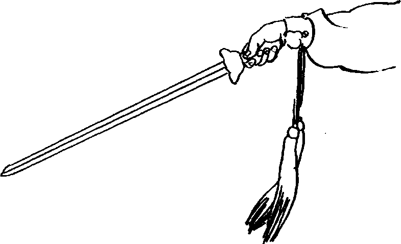 右手持剑,正手,五指扣剑柄,出剑时剑锋微上扬,食指上