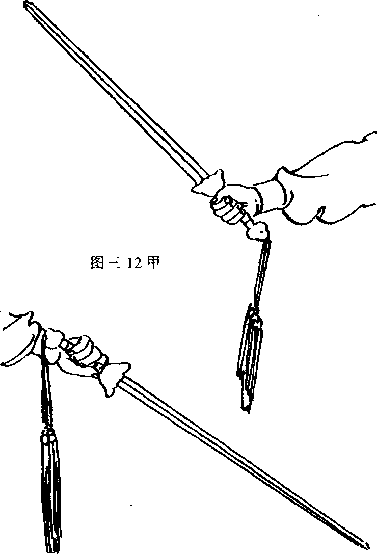 右手持剑,拨对方刺位较高(胸口以上)的剑器。正手, 五指握剑,握实;拇指与食指相扣,向外横压剑柄;小指根 及掌缘向里横压剑柄;剑锋向前上方,竖剑,使剑背向外侧 抽击。手腕向外旋转以增强拨击敌剑之力。(图三12甲)